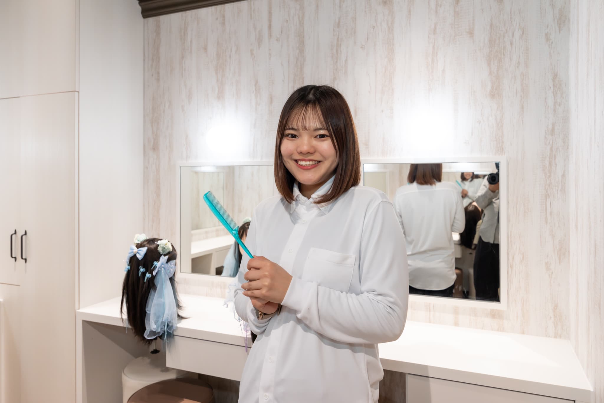 スタイリストとして髪のブラッシングやアレンジの方法を学んだらマネキンで実践します。ヘアクリップやリボンを使ってもOK!慣れてきたらご家族さまにお客さまになっていただき、練習の成果を披露しましょう♪