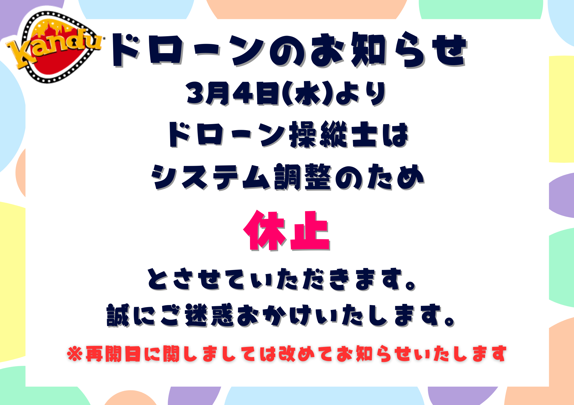 ドローン操縦士に関するお知らせ 2026.03.03 いつもカンドゥー幕張をご利用いただき、誠にありがとうございます。 システム調整のため、2026年3月4日(水)より 「ドローン操縦士」のアクティビティを休止とさせていただきます。 誠にご迷惑をおかけいたします。 再開日につきましては、決まり次第あらためてお知らせいたします。 一覧に戻る