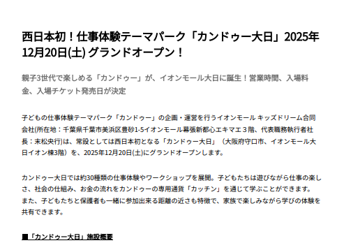 西日本初!仕事体験テーマパーク「カンドゥー大日」2025年12月20日(土) グランドオープン!