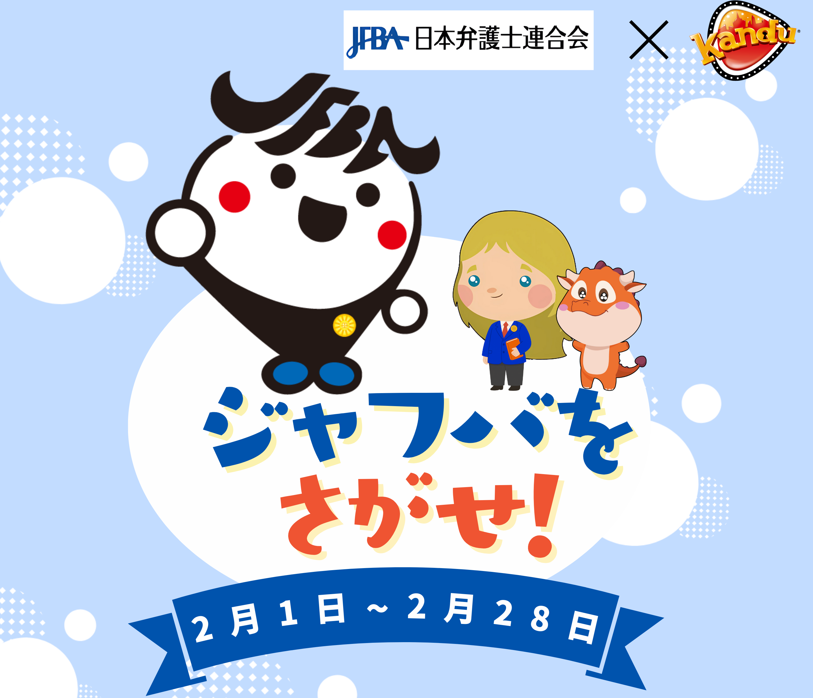 2月1日(日)〜2月28日(土) の期間中、カンドゥー新利府館内で 日弁連広報キャラクター「ジャフバ」探しイベント を開催します!